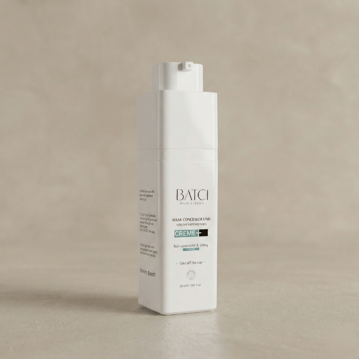 Batci Haarconcealer an alle kahlen und lichten Stellen auftragen und einmassieren und einwirken lassen.